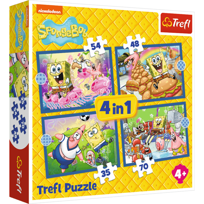 Podwodne życie SpongeBoba to 4 niezależne układanki dla dzieci, zaprojektowane z myślą o małych fanach przygód bohaterów bajki SpongeBob. Po ułożeniu puzzli powstaną 4 obrazki, z czego największy o wymiarach 285x205 mm. Zróżnicowana liczba elementów pozwala na zabawę zarówno młodszym, jak i nieco starszym dzieciom.