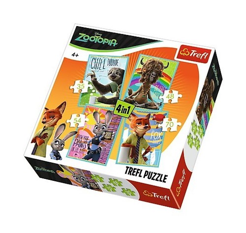 Nie jedna, nie dwie, ale aż cztery układanki zamknięte w jednym pudełku to prawdziwa gratka dla miłośników puzzli! Po ułożeniu otrzymamy cztery obrazki różnej wielkości z bohaterami filmu ""Zwierzogród"". Zestaw doskonale spełnia oczekiwania rodzeństwa - każdy ułoży swój ulubiony obrazek nawet w tym samym czasie. Zróżnicowana liczba elementów pozwala na zabawę zarówno młodszym, jak i nieco starszym dzieciom. Dodatkowym urozmaiceniem zabawy może być układanie na czas, porównywanie obrazków, szukanie różnic i podobieństw.