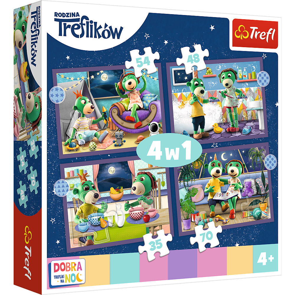 Puzzle 4w1 z serii Rodzina Treflików - Trefliki przed snem firmy Trefl. Produkt dla dzieci od 4. roku życia.