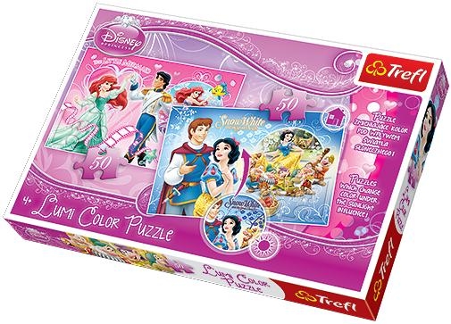 Arielka i Kopciuszek - Puzzle Lumi ColorLumi Color to niepowtarzalne puzzle, które zmieniają kolor!Użyj pudełka jako podstawki do układania puzzli, a po ich ułożeniu wystaw je na działanie promieni słonecznych i zobacz, które fragmenty zmieniły swoją barwę!Zestaw 2 układanek 50 elementowych z księżniczkami Disneya: Arielką i Kopciuszkiem. Po ułożeniu powstaną obrazki o wymiarach 32x21,5 cm. Wysoką jakość, nasycenie kolorów i bezpieczeństwo układania zapewnia kalandrowany papier odbijający światło i wykorzystanie materiałów ekologicznych.