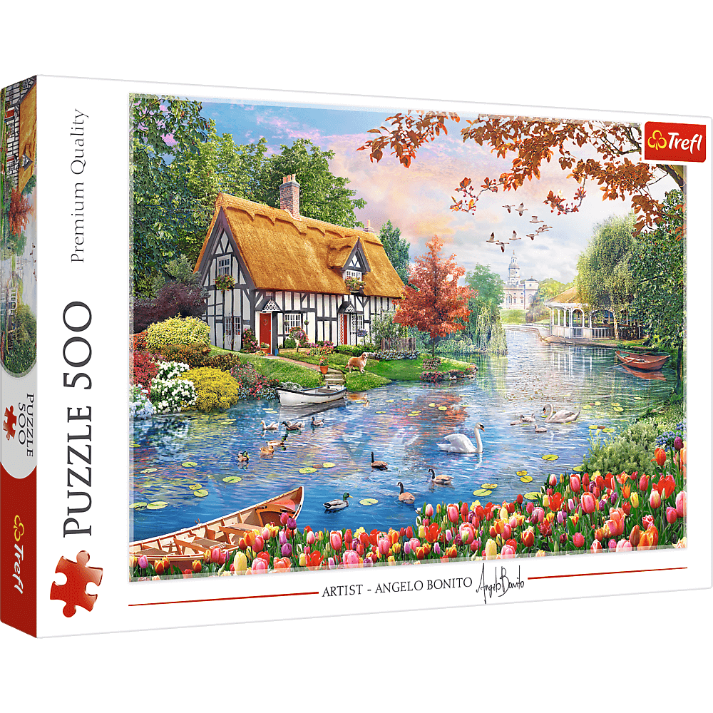 Puzzle Cicha przystań składają się z 500 elementów i po ułożeniu stworzą obraz artysty Angelo Bonito przedstawiający, otoczony kwiatami, dom nad rzeką. Gotowa układanka ma wymiary 480x340 mm.