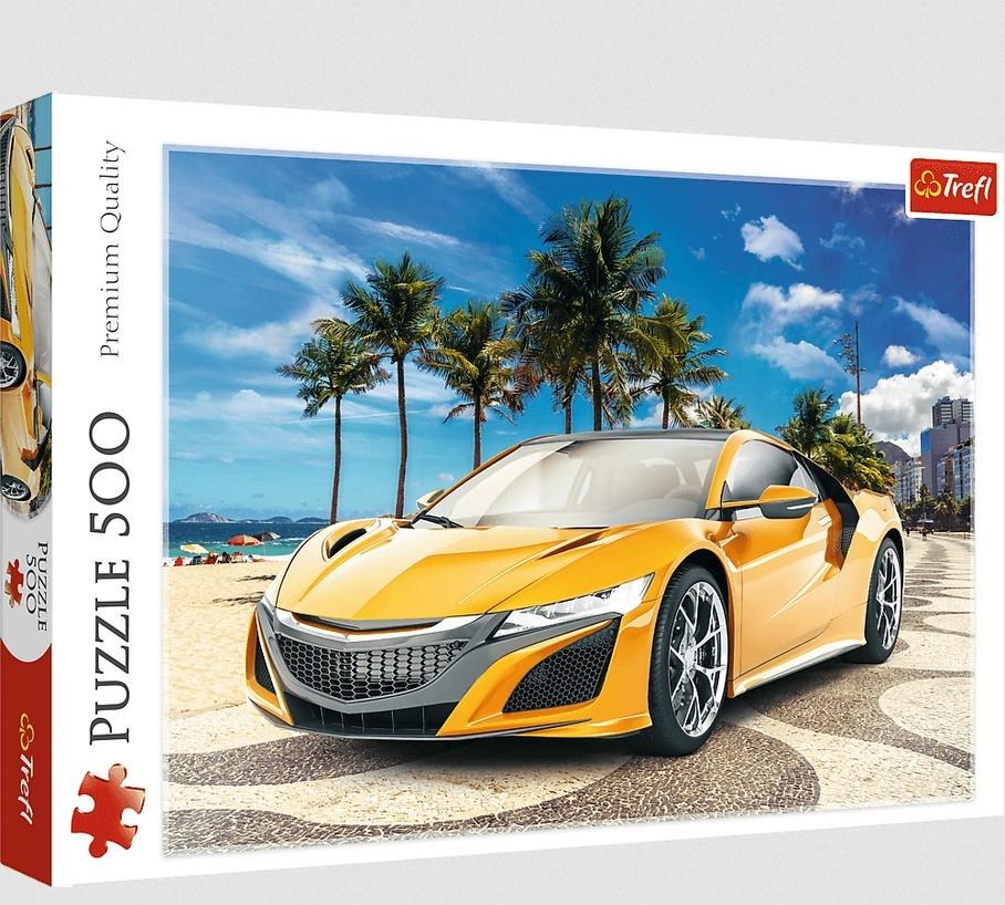 Puzzle 500 elementów przedstawiające imponujące sportowe auto w pięknym, żółtym kolorze z letnią, miejską scenerią w tle. Po ułożeniu powstanie obrazek o wymiarach 48x34 cm. Wysoką jakość, nasycenie kolorów i bezpieczeństwo układania zapewnia kalandrowany papier odbijający światło, pokryty ekologicznymi farbami spożywczymi.