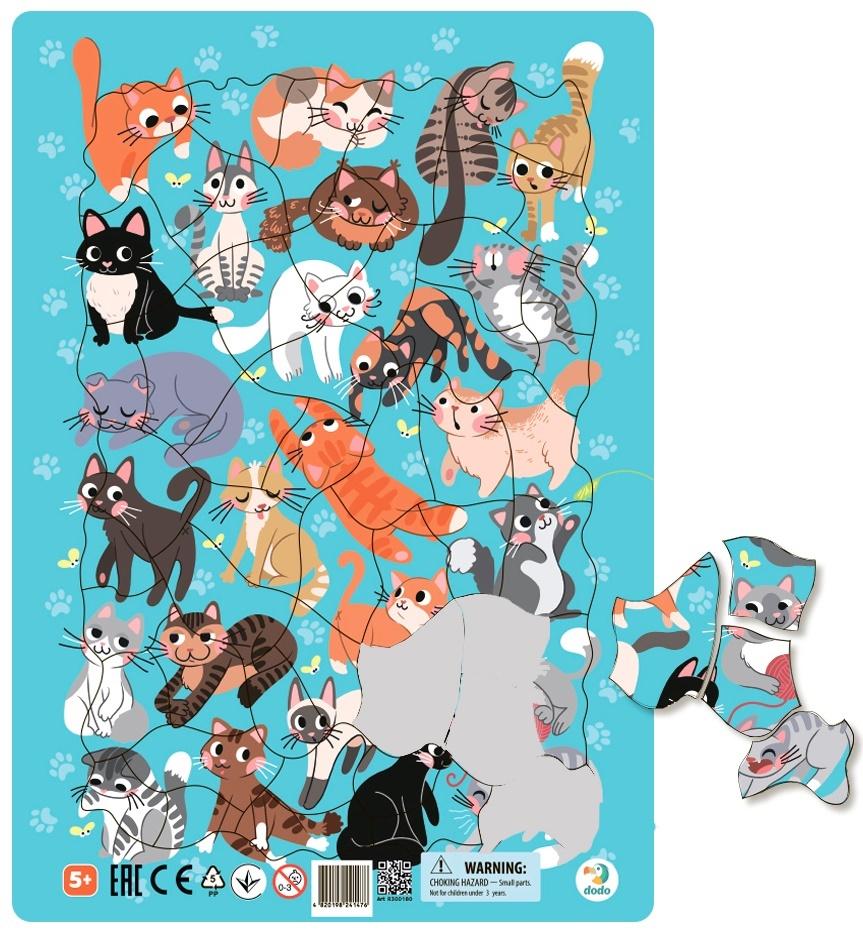 Wiek: 5+Puzzle DODO powstały specjalnie z myślą o najmłodszych. Mogą cieszyć się nimi zarówno kilkulatki, jak i kilkunastomiesięczne maluchy. Bogactwo wzorów i kolorów wprawia w zachwyt. Znajdziemy wśród nich motywy takie jak: zwierzęta, pory roku, droga mleczna itp., przygotowane w formie kolorowych ilustracji. Zestawy różnią się liczbą elementów oraz ich wielkością, co daje możliwość szerokiego wyboru zgodnie z wiekiem dzieckaPuzzle ramkowe 53 elementy - to doskonałe połączenie zabawy z edukacją. Układanie ich jest niezwykłe! Puzzle mają nieregularny kształt, dzięki czemu dziecko ćwiczy nie tylko koncentrację, ale także trenuje swój mózg. Tematyka obrazków jest bogata w informacje, które w przyjazny i miły sposób przyswajają dzieci. Na planszy znajduje się obrys elementów, który ułatwia ich ułożenie. W serii znajdują się puzzle o tematyce: kontynentów na których zamieszkują różne zwierzęta, (Australia, Ameryka Południowa, Ameryka Północna, Antarktyda, Afryka, Euroazja) oraz serie puzzli zwierząt (koty, psy i dinozaury). W tym zestawie poznasz koty domowe.