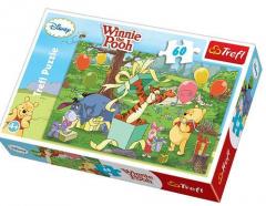 Puzzle 60 elementów z bohaterami uwielbianej przez dzieci bajki o Kubusiu Puchatku. Po ułożeniu powstanie obrazek o wymiarach 33x22cm. Wysoką jakość, nasycenie kolorów i bezpieczeństwo układania zapewnia wykorzystanie materiałów ekologicznych. Puzzle oparte na licencji Disneya.