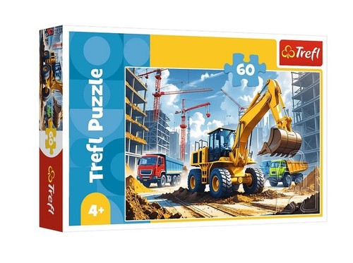 Traktor koparko-ładowarka to puzzle składające się z 60 elementów, zaprojektowane z myślą o małych fanach motoryzacji. Po ułożeniu układanki powstanie obrazek o wymiarach 330x220 mm.
