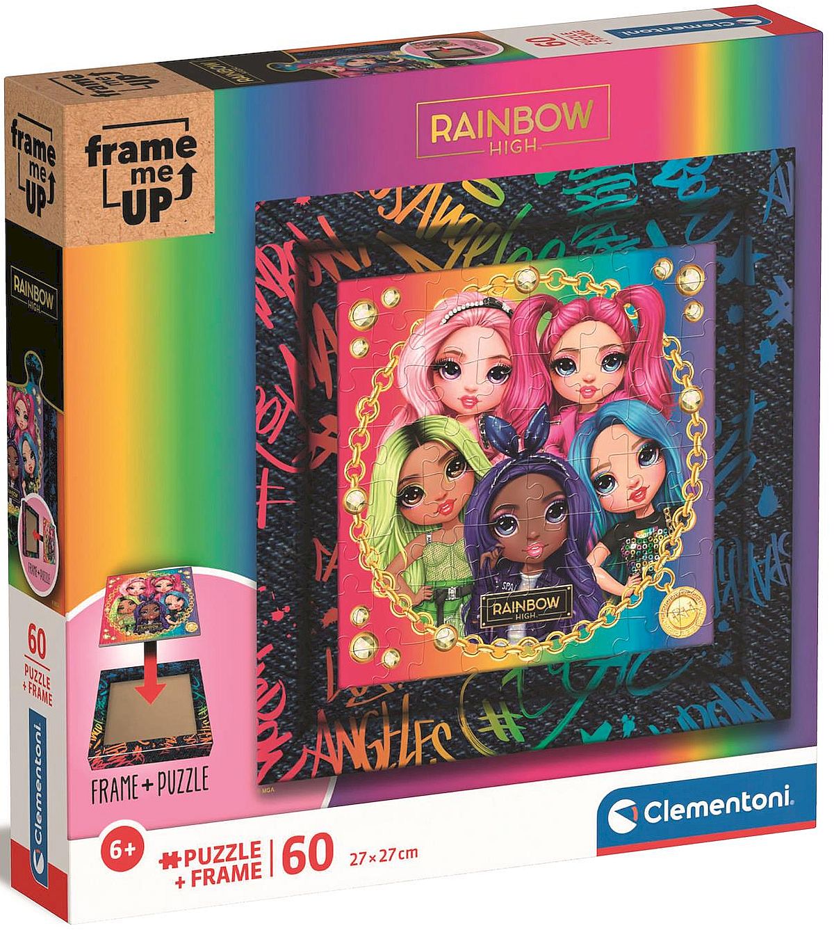Puzzle składające się z 60 elementów, motyw Rainbow High. Ramka do puzzli w zestawie.