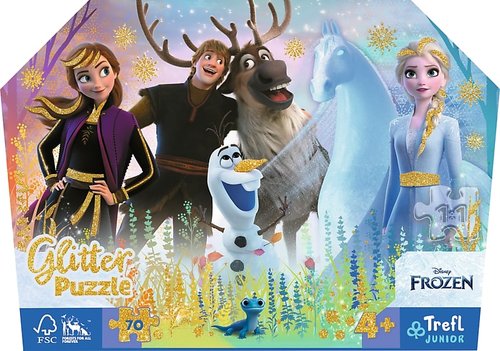 Magiczna przyjaźń - puzzle glitter marki Trefl Junior to układanka składająca się z 70 elementów. Jest ozdobiona delikatnym złotym brokatem, który sprawia, że opakowanie i poszczególne elementy pięknie się mienią.