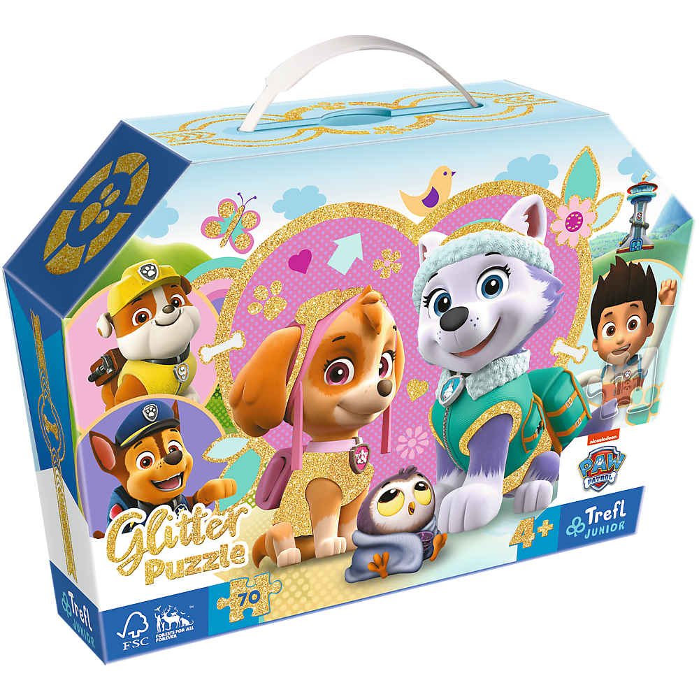 Puzzle Glitter Urocza Skye i Everest marki Trefl Junior to układanka składająca się z 70 elementów. Jest ozdobiona delikatnym złotym brokatem, który sprawia, że opakowanie i poszczególne elementy pięknie się mienią.