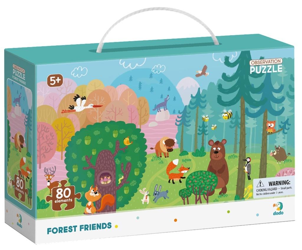 Puzzle obserwacyjne rozwijają spostrzegawczość, cierpliwość, koncentrację i pamięć u dzieci. W ramce puzzli znajdują się pojedyncze elementy, które należy odszukać na obrazku. Puzzle obserwacyjne Leśni przyjaciele po ułożeniu przedstawiają życie zwierzaków w ich naturalnym środowisku.