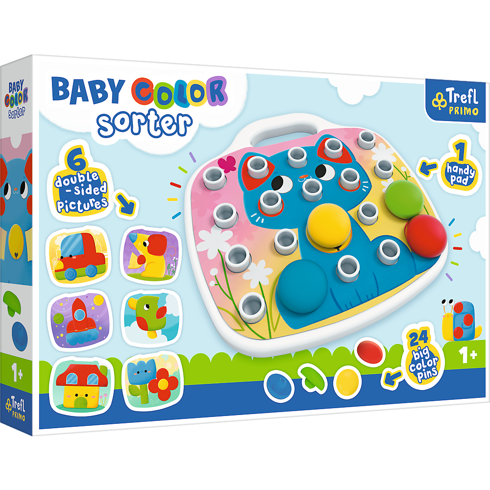 Sorter kolorów to układanka z dużymi kolorowymi pinezkami dla najmłodszych dzieci. Barwne ilustracje zachęcają maluchy do zabawy w dopasowywanie kolorów. Zabawka wprowadza dzieci w świat kolorów oraz wspiera rozwój manualny.