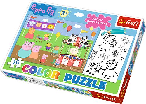 Dwustronne puzzle do kolorowania ze świnką Peppą. Po ułożeniu powstanie obrazek o wymiarach 41x27,5 cm.