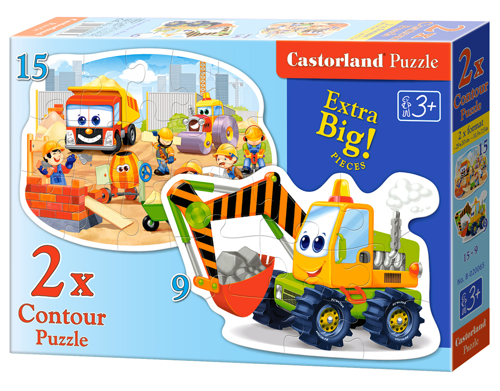2 x Puzzle 9*15 PUZZLE KONTUROWE - 2 układanki w 1 pudełku !!! Puzzle dla najmłodszych, składające się z dwóch oddzielnych obrazków o zróżnicowanym stopniu trudności. Żywe kolory, odpowiednio dobrane wzornictwo oraz duże elementy sprawią, że małe dziecko z łatwością ułoży każdy obrazek. Puzzle te zapraszają do poznania fascynującego świata bajek, zwierząt i motoryzacji. Pomogą rozwinąć zdolność kojarzenia oraz zwiększyć sprawność manualną. 2 obrazki w formacie 29x20cm, wiek 3 +.