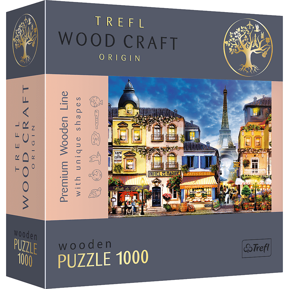 Seria puzzli 1000 elementów jest idealna dla wszystkich miłośników układanek, pozwoli stworzyć obrazek o wymiarach 37,5 x 25.,4 cm przedstawiający widok na romantyczną, paryską uliczkę. Układanka została wykonana z drewna, a opakowanie przyjazne środowisku w całości z tektury. Puzzle zawierają nieregularne elementy oraz 100 figurek w kształtach francuskich zabytków i symboli.