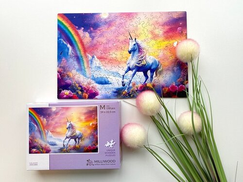 "Puzzle drewniane jednorożec o nieregularnych kształtach przedstawiają konia z rogiem z tęczą na łące pełnej kwiatów. Wokół kwiatów unoszą się motyle, a ptaki śpiewają melodyjnie. To miejsce, w którym każdy kwiat ma swoją opowieść, a każda chwila jest pełna magii. To właśnie ta niezwykła energia, ta magia łąki, została uchwycona na puzzlach drewnianych, które teraz mogą przenieść każdego, kto się nimi bawi, do tego magicznego świata pełnego szczęścia i piękna.