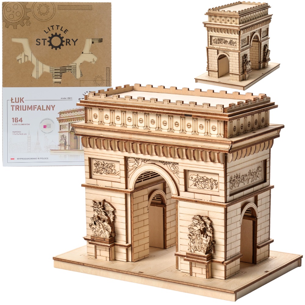 Drewniane puzzle 3D w kształcie monumentalnego pomnika w formie łuku triumfalnego, który stoi na placu Charles-de-Gaulle w Paryżu. Zestaw został wykonany z wysokiej jakości sklejki i jest w postaci arkuszy z wstępnie wyciętymi i ponumerowanymi elementami. Przed montażem należy oddzielić części od wykroju, a następnie połączyć bez użycia kleju, zgodnie ze szczegółową instrukcją dołączoną do opakowania. Zabawka edukacyjna, która po złożeniu może również służyć jako dekoracja. Uwaga - zestaw może zawierać małe elementy, podczas składania puzzli, dzieci muszą pozostać pod opieką dorosłych.