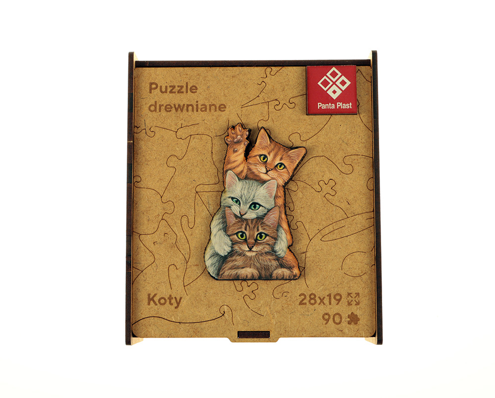 Kolorowe, drewniane puzzle dostępne w różnych wzorach. W Ich charakterystyczną cechą są elementy składowe występujące w kształtach zwierząt lub innych obiektów. Puzzle idealnie nadają się na prezent oraz do wspólnej zabawy. Po złożeniu mogą stać się również wyjątkowym elementem dekoracji dowolnego wnętrza. Pakowane w drewnianym pudełku. Składają się ze 90 elementów. Wielkość: A4.