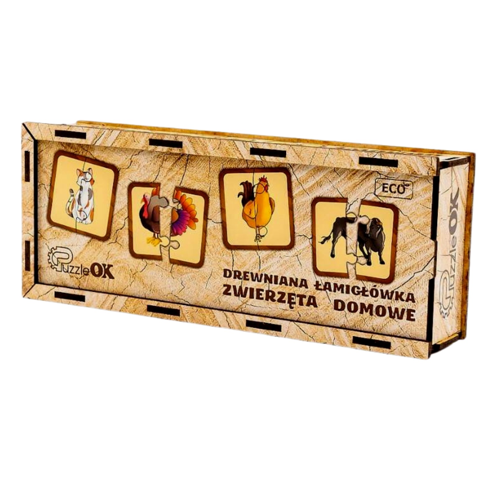Zestaw puzzli: zabawa zestawem polega na łączeniu dwóch elementów w jeden tak, aby powstał obrazek zwierzaka. Aż 20 różnych obrazków przedstawia różnorodne zwierzęta domowe, takie jak pies, kot, królik czy kura. Dzięki temu dzieci mają możliwość poznawania różnorodnych gatunków zwierząt i ich cech charakterystycznych.