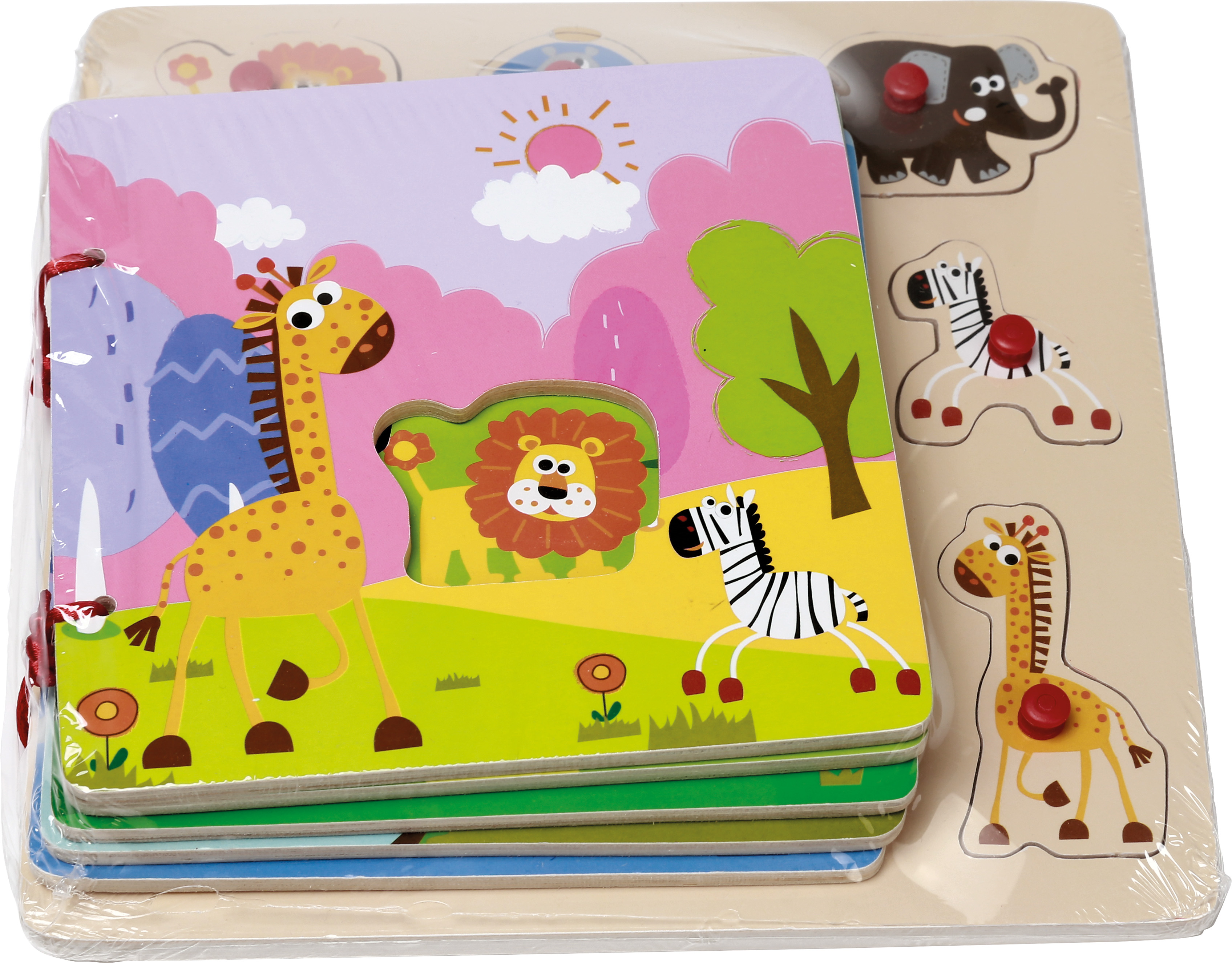 Drewniana układanka dla najmłodszych w formie książeczki. 5 elementów z pinezkami.