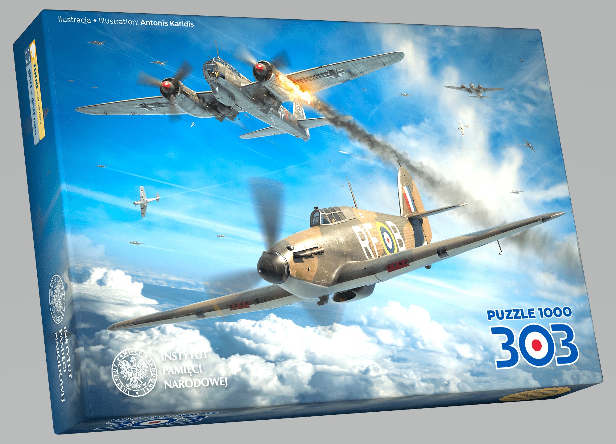 W pudełku znajdziesz puzzle złożone z 1000 elementów przedstawiające walkę legendarnego Dywizjonu 303 z niemiecką wyprawą bombową na Londyn oraz bogato ilustrowaną broszurę o udziale polskiego lotnictwa w II wojnie światowej. Na 24 stronach zobaczysz sylwetki pilotów, mapy,oznaki dywizjonów, samoloty na których walczyli Polacy, statystyki zestrzeleń i wiele innych ciekawych informacji.