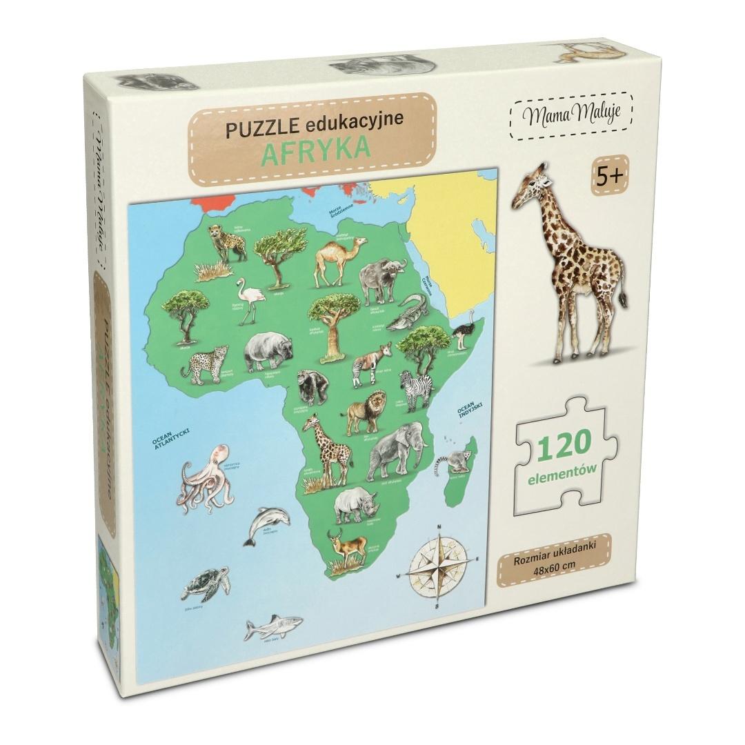 Puzzle przedstawiają mapę Afryki, na której widnieje aż 21 gatunków zwierząt charakterystycznych dla poszczególnych miejsc. Ich ilustracje powstały za pomocą pędzla i akwareli. Zachowanie detali i realistyczny wygląd sprawia, że dzieci mogą uczyć się specyfiki a także różnorodności geograficznej i przyrodniczej danego kontynentu.