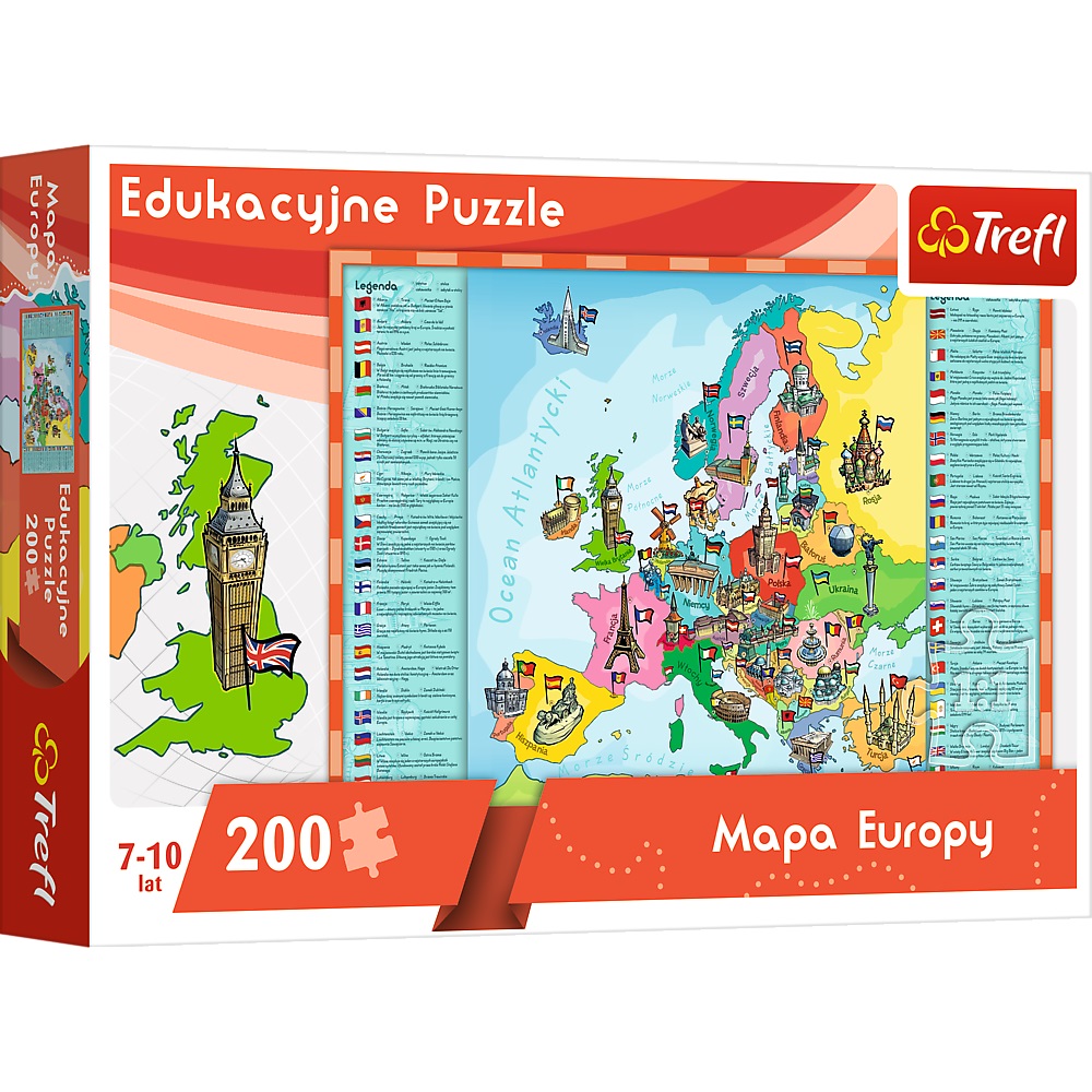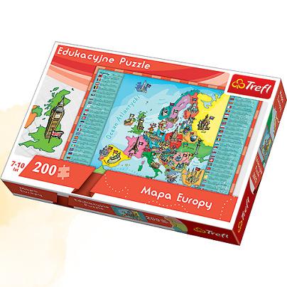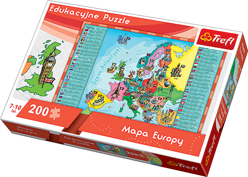 Mapa Europy - Puzzle Edukacyjne Mapa Europy to puzzle, które zwrócą uwagę zarówno dzieci, jak i ich rodziców. Prezentowane puzzle w przyjazny sposób łączą zabawę z nauką oraz pobudzają wyobraźnię i ciekawość świata. Układanka została specjalnie dostosowana do możliwości poznawczych dzieci w wieku 7-10 lat. Po ułożeniu powstanie obrazek o wymiarach 60x40 cm.