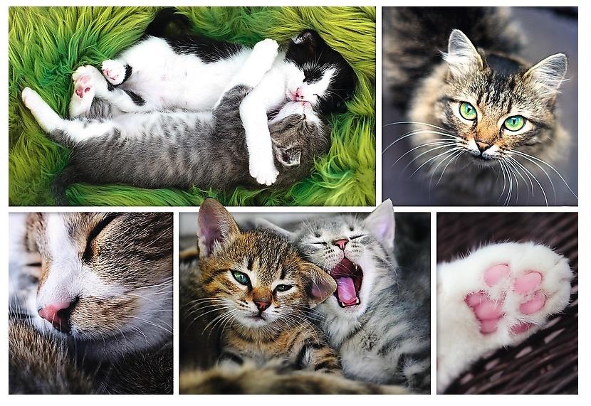 Puzzle 1500 elementów przedstawiające wspaniały kolaż obrazów z kotami. Puzzle te mogą być świetnym prezentem dla miłośników kotów. Po ułożeniu powstanie obrazek o wymiarach 85x58 cm. Wysoką jakość, nasycenie kolorów i bezpieczeństwo układania zapewnia wykorzystanie materiałów ekologicznych..