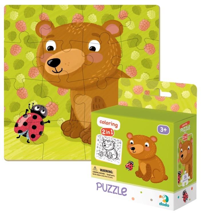 To dwustronna zabawa. Na jednej stronie znajduje się zwierzęcy obrazek (16 elementów), na drugiej zaś znajdziemy ten sam wzór w formie kolorowanki, którą maluch śmiało może pokolorować według własnego uznania. W tym zestawie na obrazku znajdziemy sympatycznego Misia. Wiek: 3+ m+, Ilość elementów: 16. W serii DODO Puzzle + kolorowanka można odkryć 4 zestawy o różnej tematyce: Jeżyk, Misiu, Pingwinek i Zajączek