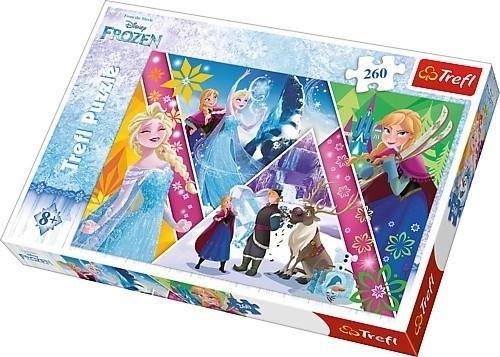 Puzzle 260 elementów z bohaterami filmu Disneya "Kraina lodu". Po ułożeniu powstanie obrazek o wymiarach 60x40 cm. Wysoką jakość, nasycenie kolorów i bezpieczeństwo układania zapewnia kalandrowany papier odbijający światło i wykorzystanie materiałów ekologicznych.