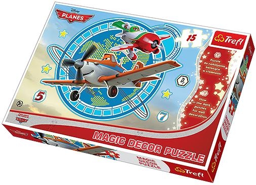 Samoloty - Puzzle Magic DecorMAGIC DECOR to duże, świecące w ciemności puzzle, którymi można również ozdobić pokój dziecka! Zastosowanie specjalnej techniki, sprawia, że układanka wystawiona na promienie słoneczne lub sztuczne światło będzie świeciła w ciemności! Po ułożeniu powstanie obrazek o wymiarach 60x40 cm z bohaterami filmu animowanego Disneya ""Samoloty"".W skład produktu wchodzą: puzzle 15-elementowe, ramka pocięta na puzzle z dodatkowymi wyciskanymi elementami do zakomponowania. W skład produktu wchodzą:puzzle 15-elementowe, ramka pocięta na puzzle z dodatkowymi wyciskanymi elementami do zakomponowania.