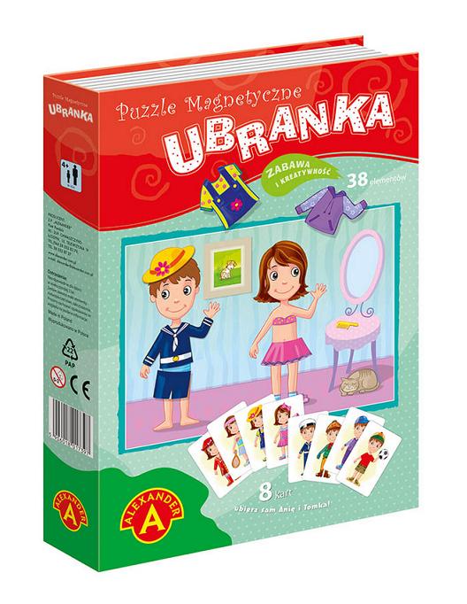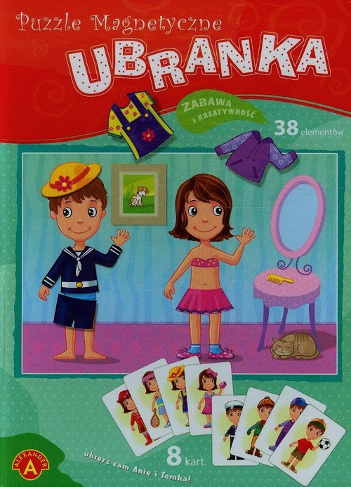Puzzle magnetyczne - ubranka dla Ani i Tomka - to wspaniała zabawa dla dziewczynek i chłopców. Kolorowe ubranka - magnesy układa się na tablicy magnetycznej, dzięki czemu zabawa jest możliwa nawet podczas podróży. Dzieci mogą ułożyć, na podstawie dołączonych kart, osiem podstawowych ubrań dla Ani i Tomka. Mogą też dowolnie zestawić elementy ubrań według własnych pomysłów i wyobraźni. Podczas zabawy dzieci ćwiczą zręczność manualną, umiejętność rozpoznawania kształtów, spostrzegawczość, pobudzają wyobraźnię i kreatywność.Zawartość pudełka: 38 puzzli magnetycznych, tablica magnetyczna, 8 kart, instrukcja.