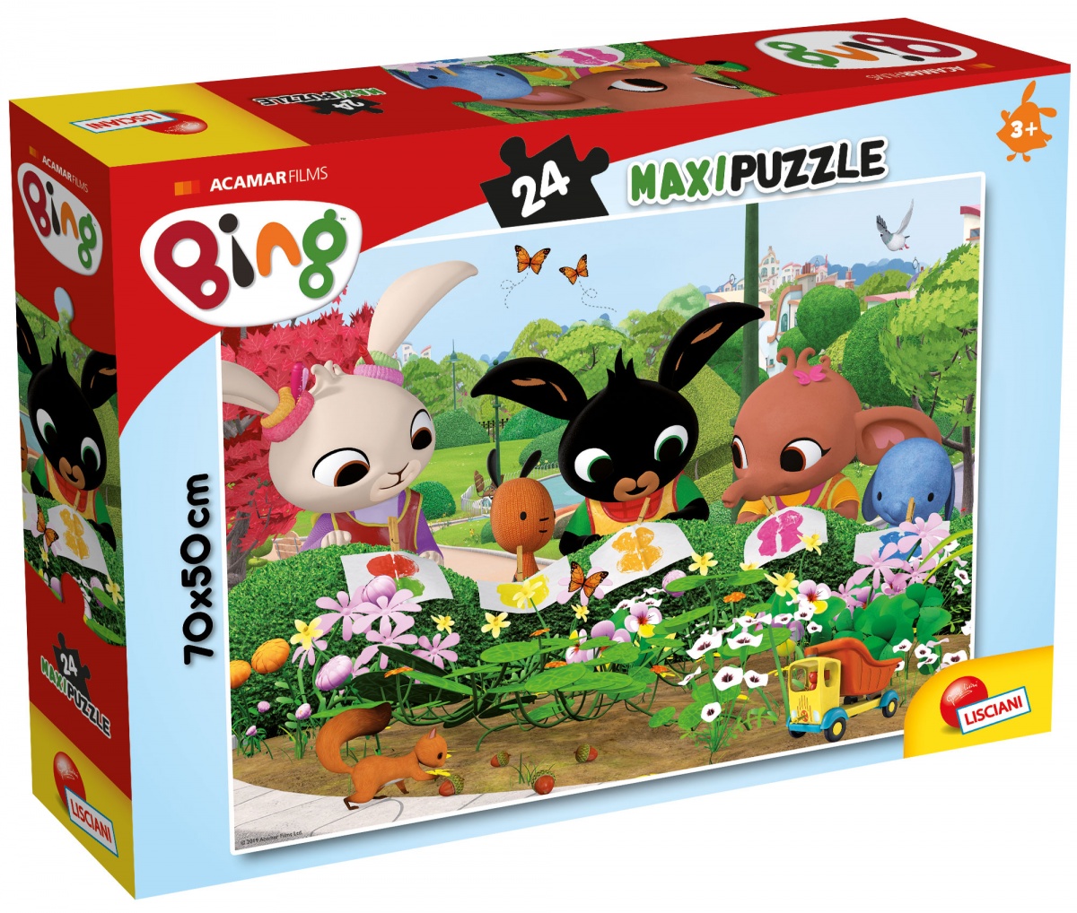 Zestaw składający się z 24 puzzli, które pozwalają złożyć scenkę znaną z bajki Bing podczas podziwiania natury w ogrodzie. Po złożeniu, puzzle tworzą obrazek o wymiarach 70x50cm.
