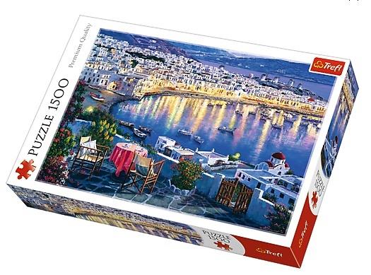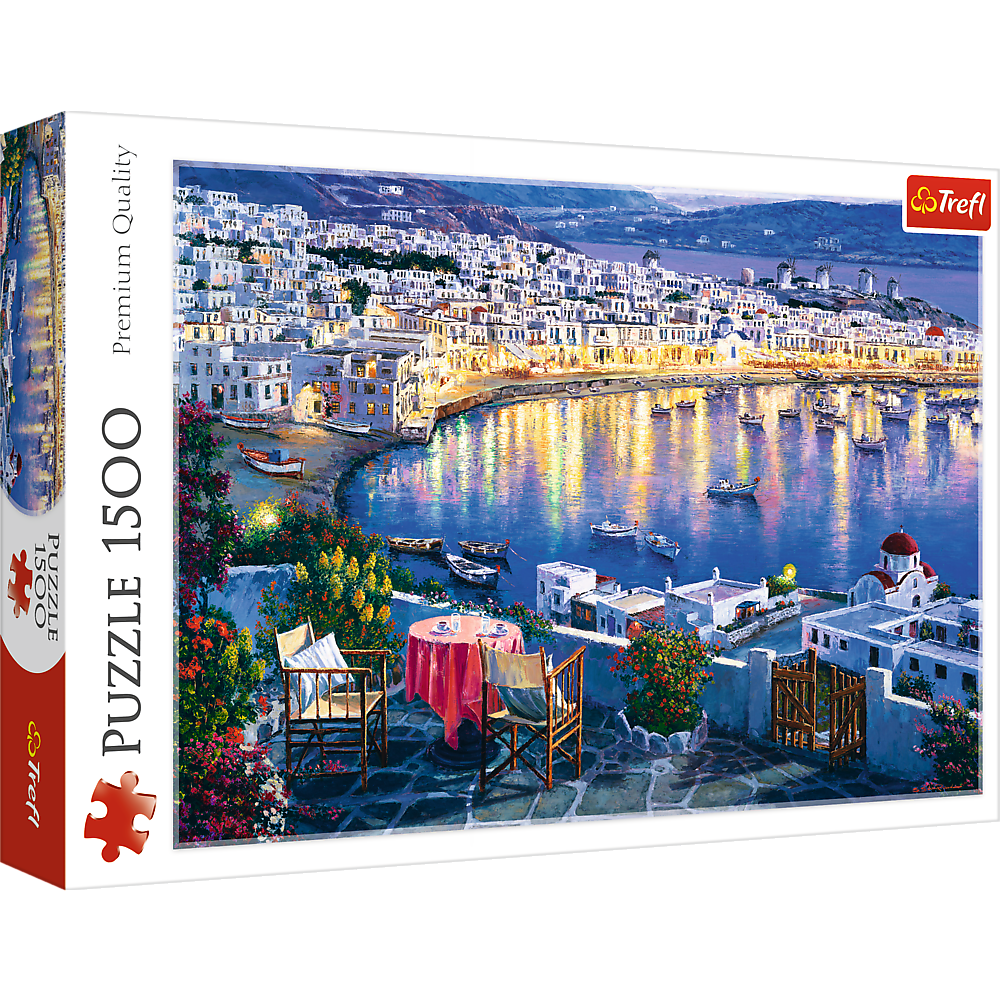 Puzzle 1500 elementów z widokiem na grecką wyspę Mykonos. Po ułożeniu powstanie obrazek o wymiarach 85x58 cm. Wysoką jakość, nasycenie kolorów i bezpieczeństwo układania zapewnia wykorzystanie materiałów ekologicznych.