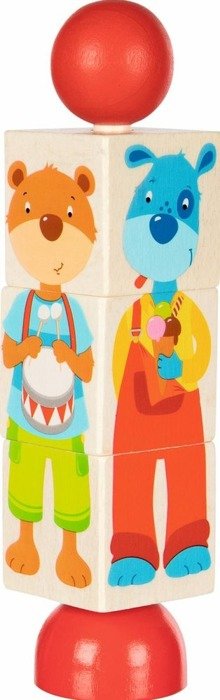 Niby tylko trzy klocki na kołku, ale ile różnych możliwości. Zabawa we właściwe układanie postaci to edukacyjna rozrywka, za to zabawniej jest obserwować, jak śmiesznie wyglądają postaci, których elementy nie pasują do siebie. Zabawa takimi puzzlami rozwija u dzieci zmysł obserwacji, motorykę małą i logiczne myślenie. Klocki wykonane są z drewna.
