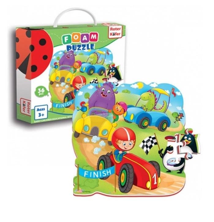 Kto pierwszy? Przyłącz się do wyścigu! Dziecko powinno zebrać z poszczególnych dużych elementów cały obrazek. Można bawić się na stole, na podłodze, a nawet w parku na zielonej trawie! Duże puzzle trwale mocują się, a obrazek nie rozsypuje się. Gra trenuje małą motorykę, logikę, pamięć, uczy pojęć czym są "część" i "całość".