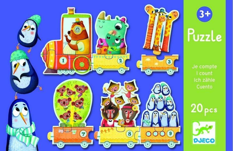 Puzzle ""POCIĄG"" to wspaniała zabawa dla miłośników układania puzzli.Proszę wsiadać odliczamy pasażerów! Nauka liczenia w formie zabawy .Wagoniki są ponumerowane, należy dopasować ilość pasażerów do odpowiedniego wagonika.Puzzle od Djeco wykonane są z grubej sztywnej tektury, dodatkowo foliowane, żeby zabezpieczyć je przed zniszczeniem.Ilość elementów: 20Wielkość opakowania: 18x12x6 cm