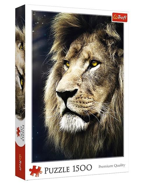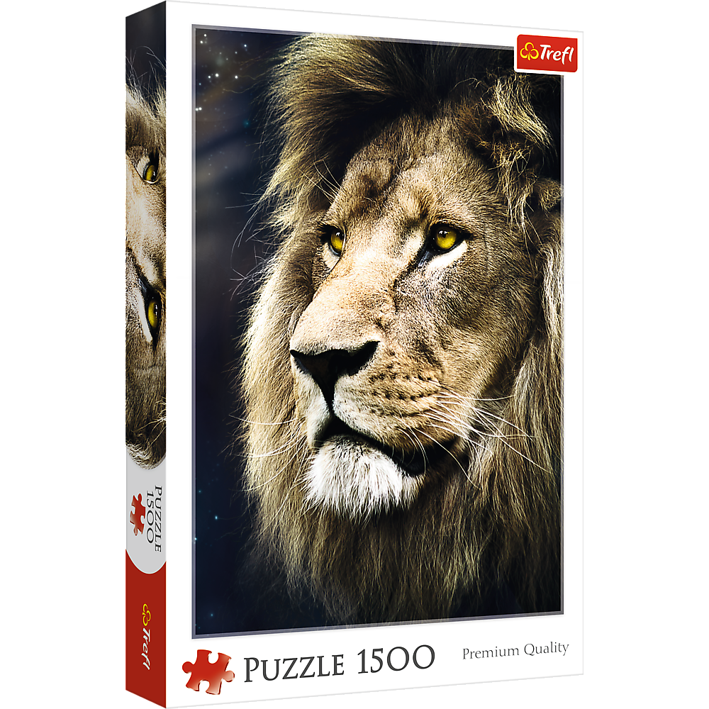 Puzzle 1500 elementów z portretem lwa. Po ułożeniu powstanie obrazek o wymiarach 85x58 cm. Wysoką jakość, nasycenie kolorów i bezpieczeństwo układania zapewnia kalandrowany papier odbijający światło, pokryty ekologicznymi farbami spożywczymi.