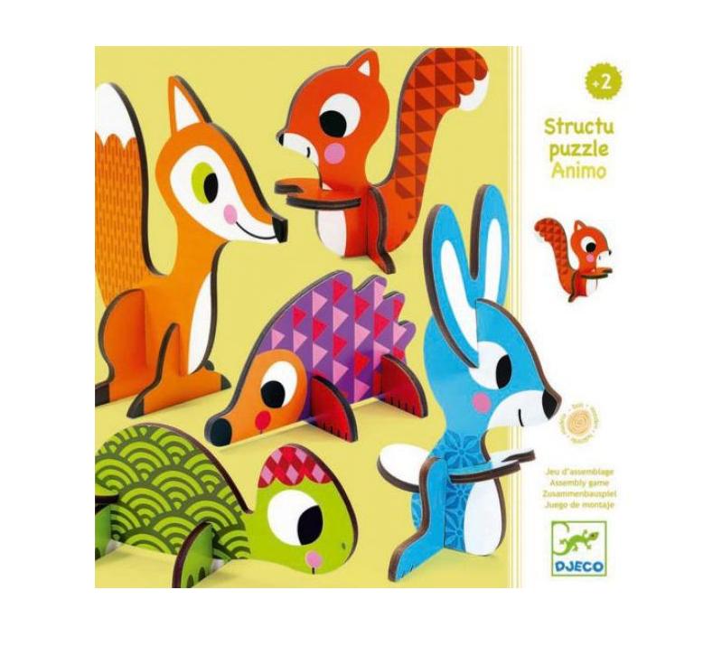 Puzzle przestrzenne Leśne Zwierzęta Puzzle przestrzenne Zwierzęta Animo wykonane sa z laminowanej, grubej tektury. Zestaw umożliwia stworzenie 5 różnych zwierząt. Należy dopasować część ciała do odpowiedniego zwierzaka. Zabawa ćwiczy u dziecka koncentrację, cierpliwość, spostrzegawczość oraz koordynację oko-ręka stymulując jego rozwój.