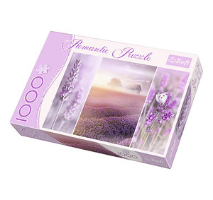 Puzzle 1000 elementów z romantycznym tryptykiem zdjęć pól lawendy. Po ułożeniu powstanie obrazek o wymiarach 68x48 cm. Wysoką jakość, nasycenie kolorów i bezpieczeństwo układania zapewnia kalandrowany papier odbijający światło, pokryty ekologicznymi farbami spożywczymi.