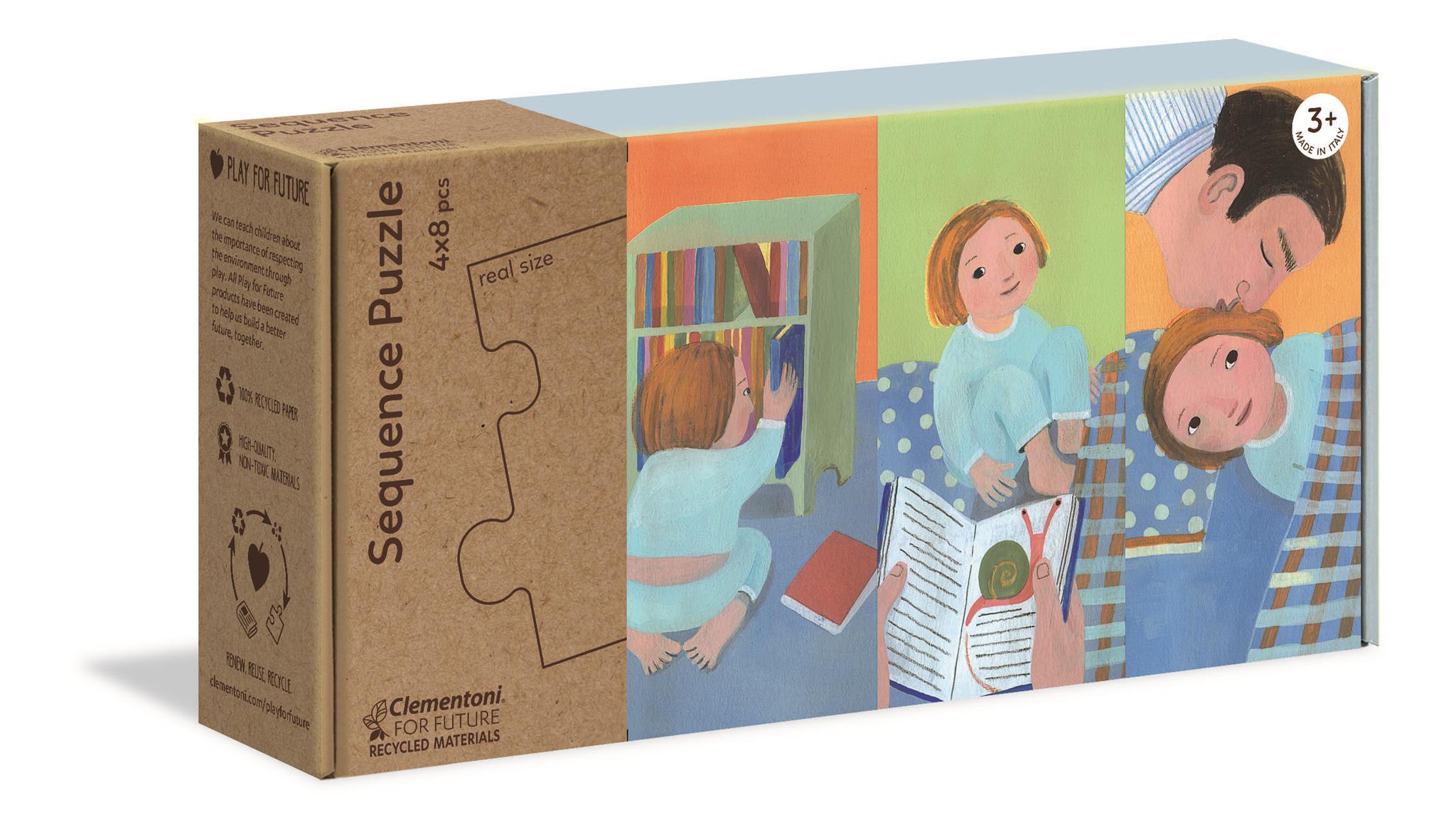 Każdy zestaw zawiera 4 układanki z 8 elementami , przedstawiające cztery różne czynności z życia codziennego: układanie się do snu, pobudkę, pieczenie ciasta i zabawę klockami.