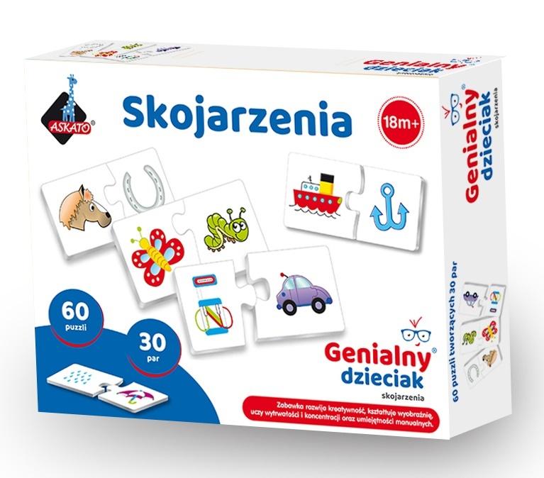 Puzzle do pary - skojarzeniaGra skupia uwagę dzieci, pozwala rozwijać wiedzę o świecie, odszukiwać elementy i dopasowywać je do siebie. Szukanie i dopasowywanie do siebie par, to doskonały trening pamięci. Puzzle przedstawiają przedmioty z najbliższego otoczenia dziecka. Podczas zabawy dzieci poszukają odpowiedzi na pytania: Co chroni przed deszczem? Czym się bawisz w piaskownicy? Gra Skojarzenia to układanka dydaktyczna zachęcająca dziecko do logicznego myślenia i analizowania. Puzzle należy odpowiednio dobrać parami tak, aby łączyć je w związek funkcjonalny np. statek- kotwica, koń-podkowa itd. itp. Dodatkowo gra świetnie ćwiczy pamięć i spostrzegawczość u dziecka, wymusza intensywne myślenie, a także sprzyja umiejętności szybkiego zapamiętywania. Układanka aktywizuje zasób słownictwa, usprawnia kluczowe elementy związane z percepcją wzrokową. Wspólna zabawa stanie się okazją do dyskusji, tworzenia historii i opowieści o otaczającym świecie. Zestaw składa się z 30 2-elementowych puzzli, które poprzez zabawę pozwalają dziecku ćwiczyć umiejętność kojarzenia, rozwijają koordynację wzrokowo-ruchową oraz poprawiają zdolności manualne.Wiek: 3+Wymiar jednego puzzla 8x8 cm