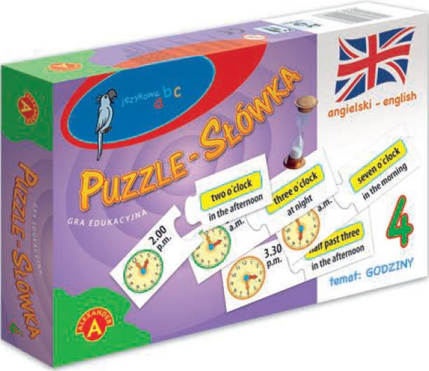 ,,Puzzle-Słówka"", to gra i zabawka dla dzieci, które umieją jużczytać i można je zachęcić do nauki języka angielskiego.Zabawka zawiera 30 dwuczęściowych elementów. Na jednejczęści znajduje się obrazek, a na drugiej jego angielskanazwa. Znajdowanie i łączenie pasujących do siebie parpuzzli, umożliwia indywidualną zabawę, w której dzieckomoże poznać pierwsze angielskie słowa. W puzzlach,,Godziny"" dzieci uczą się jednocześnie określania czasuwedług wskazań zegara.
