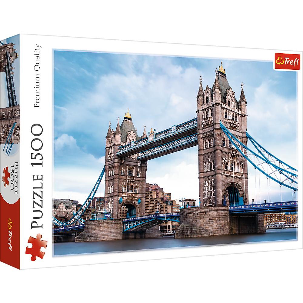 Puzzle 1500 elementów przedstawiające Tower Bridge nad Tamizą w Londynie. Po ułożeniu powstanie obrazek o wymiarach 85x58 cm. Wysoką jakość, nasycenie kolorów i bezpieczeństwo układania zapewnia kalandrowany papier odbijający światło, pokryty ekologicznymi farbami spożywczymi.