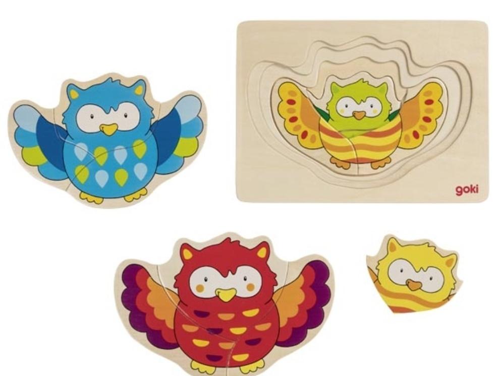 Czterowarstwowe drewniane puzzle Goki przedstawiają na każdej warstwie sowę w innym kolorze. Zabawka wspiera koordynację ręka-oko oraz pomaga w nauce kolorów. Układanka składa się z 11 elementów. Goki to producent drewnianych zabawek dla dzieci, które wyróżnia styl, żywe kolory, wysoka jakość i innowacyjność. Produkty Goki wspierają rozwój sensoryczny i motoryczny dziecka, skłaniają do logicznego myślenia, a rodzicom pomagają tworzyć zrównoważony styl zabawy bez hałasu i plastiku.