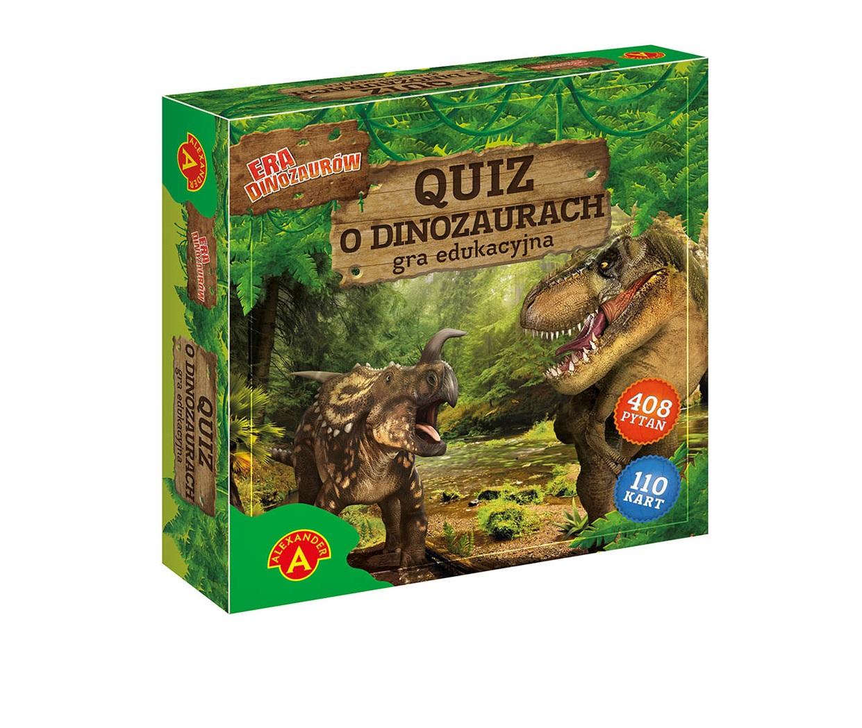 "Era Dinozaurów - Quiz o dinozaurach" jest to gra, której uczestnicy biorą udział w emocjonującej zabawie, a jednocześnie zdobywają wiedzę o fascynującej erze dinozaurów. Gracze mają do dyspozycji 97 karty pytań oraz 5 kart klepsydry. Gra posiada 2 warianty do wyboru. Zawartość pudełka: 97 karty pytań, 5 kart klepsydry, 8 kart liter, 4 pionki, 4 podstawki do pionków, 80 żetonów, 4 żetony jaj, 5 elementów podestu, plansza, kostka do gry, katapulta, klepsydra, notes, instrukcja.