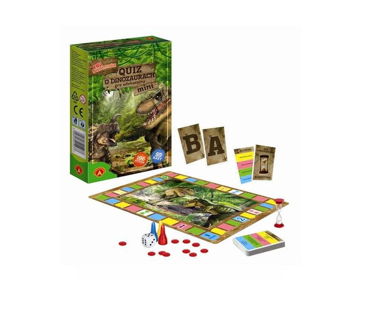 "Era Dinozaurów - Quiz o dinozaurach" jest to gra, której uczestnicy biorą udział w emocjonującej zabawie, a jednocześnie zdobywają wiedzę o fascynującej erze dinozaurów. Gracze mają do dyspozycji 44 karty pytań oraz 5 kart klepsydry. Gra posiada 2 warianty do wyboru. Zawartość pudełka: 44 karty pytań, 5 kart klepsydry, 6 kart liter, 36 żetonów, 3 pionki, kostka do gry, plansza, klepsydra, instrukcja.