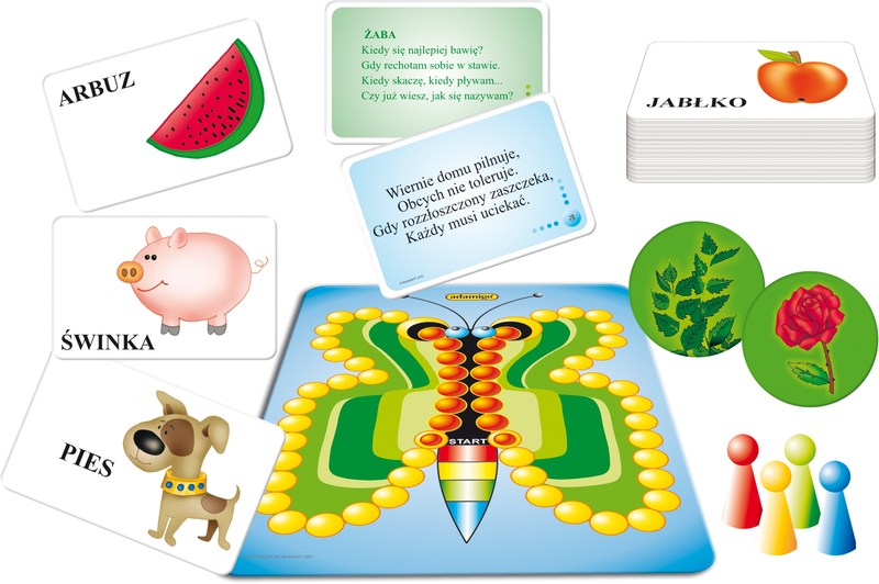 Zestaw zawiera aż 100 kart z zabawnymi rymowanymi zagadkami o zwierzętach i roślinach, plansze do gry, cztery pionki, a także dwa okrągłe żetony. Gra uczy logicznego myślenia, kojarzenia faktów, rozumienia ze słuchu i jest także ciekawą alternatywą nauki o przyrodzie. Oprócz cech edukacyjnych zestaw skłania dzieci do pozytywnej rywalizacji w grupie.