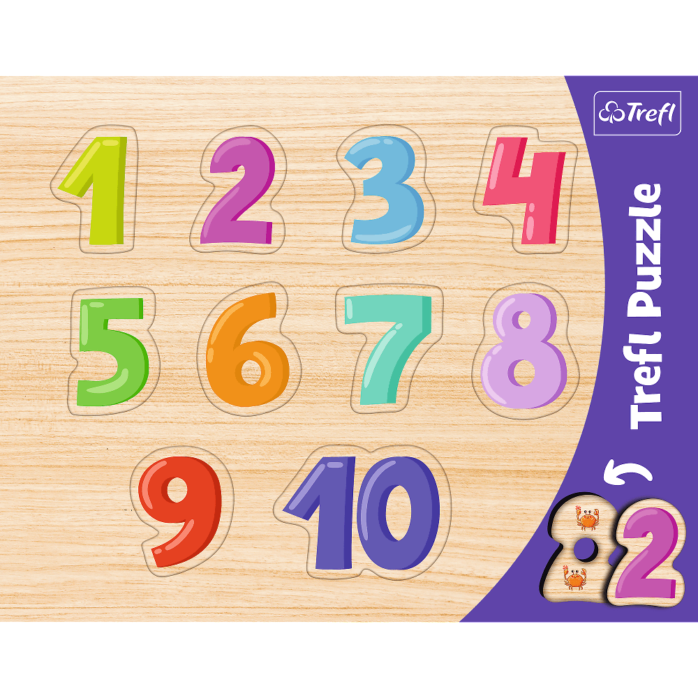 Ramkowe Układanki Kształtowe - Cyferki to duże, tematyczne puzzle edukacyjne dla najmłodszych dzieci. Dzięki otworom znajdującym się na odwrocie planszy, z łatwością można wyjąć każdy element i zobaczyć co się pod nim kryje. Układanka pomaga dzieciom w nauce cyferek i kolorów.