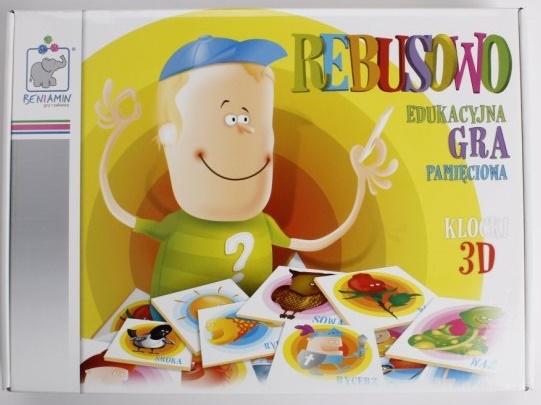GRA PAMIĘCIOWA REBUSOWO przygotowana z myślą o dzieciach od 6 lat. Jej zadaniem jest ćwiczenie pamięci wzrokowej i spostrzegawczości, a także kojarzenie i rozszyfrowanie odpowiednich rysunków i napisów.