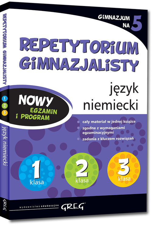 Repetytorium gimnazjalisty - język niemieckito doskonała pozycja dla wszystkich gimnazjalistów przygotowujących się do egzaminu z języka niemieckiego, zarówno na poziomie podstawowym, jak i rozszerzonym. Książka jestw pełni zgodna z nową podstawą programową, a treści z poziomu rozszerzonego wyróżniono w niej za pomocą czytelnego oznaczenia graficznego. Dzięki temu łatwo odróżnić poziom podstawowy od dodatkowych informacji.Książka prezentuje dokładnie omówione wszystkie wymagane wiadomości leksykalne - słówka, przykładowe zdania i liczne zadania, sprawdzające zdobytą wiedzę. Część gramatyczna w przystępny sposób wyjaśnia wszystkie wymagane zagadnienia z gramatyki języka niemieckiego i również opatrzona jest licznymi ćwiczeniami. Całość uzupełnia bogaty słowniczek, stanowiący idealną pomoc w nauce. Dzięki temu każdy gimnazjalista przygotowujący się zRepetytorium...Wydawnictwa GREG osiągnie sukces na egzaminie gimnazjalnym!Serdecznie polecamy!