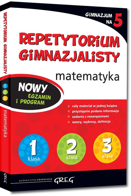 Repetytorium Gimnazjalisty Matematyka wydawnictwa GREG to pozycja, której poszukiwali wszyscy gimnazjaliści. Jest ono odpowiedzią zarówno na potrzeby dobrych uczniów, jak i tych, którzy jak dotąd mieli problemy z matematyką. Jako pierwsza wśród książek tego typu jest napisana językiem w pełni zrozumiałym, bez przeładowania niepotrzebnymi definicjami i pojęciami. Autorce książki udało się doskonale ująć cały wymagany w gimnazjum materiał i przedstawić go w przystępny sposób. (..)Największe atuty Repetytorium... to ujęcie ważnych treści w ramki, dzięki czemu uczeń bez problemów odnajdzie je na stronie, oraz świetnie opracowane zadania. Zostały one uzupełnione o szczegółowe objaśnienia, prowadzące krok po kroku aż do rozwiązania i pokazujące, co i jak należy robić. Dzięki temu żaden uczeń nie ""zginie"" w połowie zadania, jak to często dzieje się na lekcji.Repetytorium Gimnazjalisty Matematyka wydawnictwa GREG jest niezbędne nie tylko dla tych, którzy przygotowują się do egzaminu gimnazjalnrgo. Zostało ono także pomyślane jako pomoc podczas całych trzech lat anuki w gimnazjum - przyda się przed klasówką, powtórką, odpowiedzia oraz wtedy, gdy jakaś część materiału okaże się szczególnie trudna./*